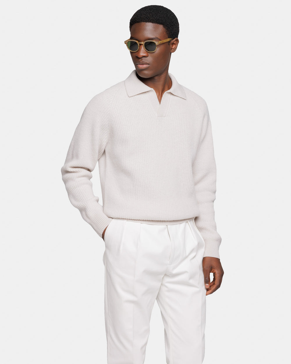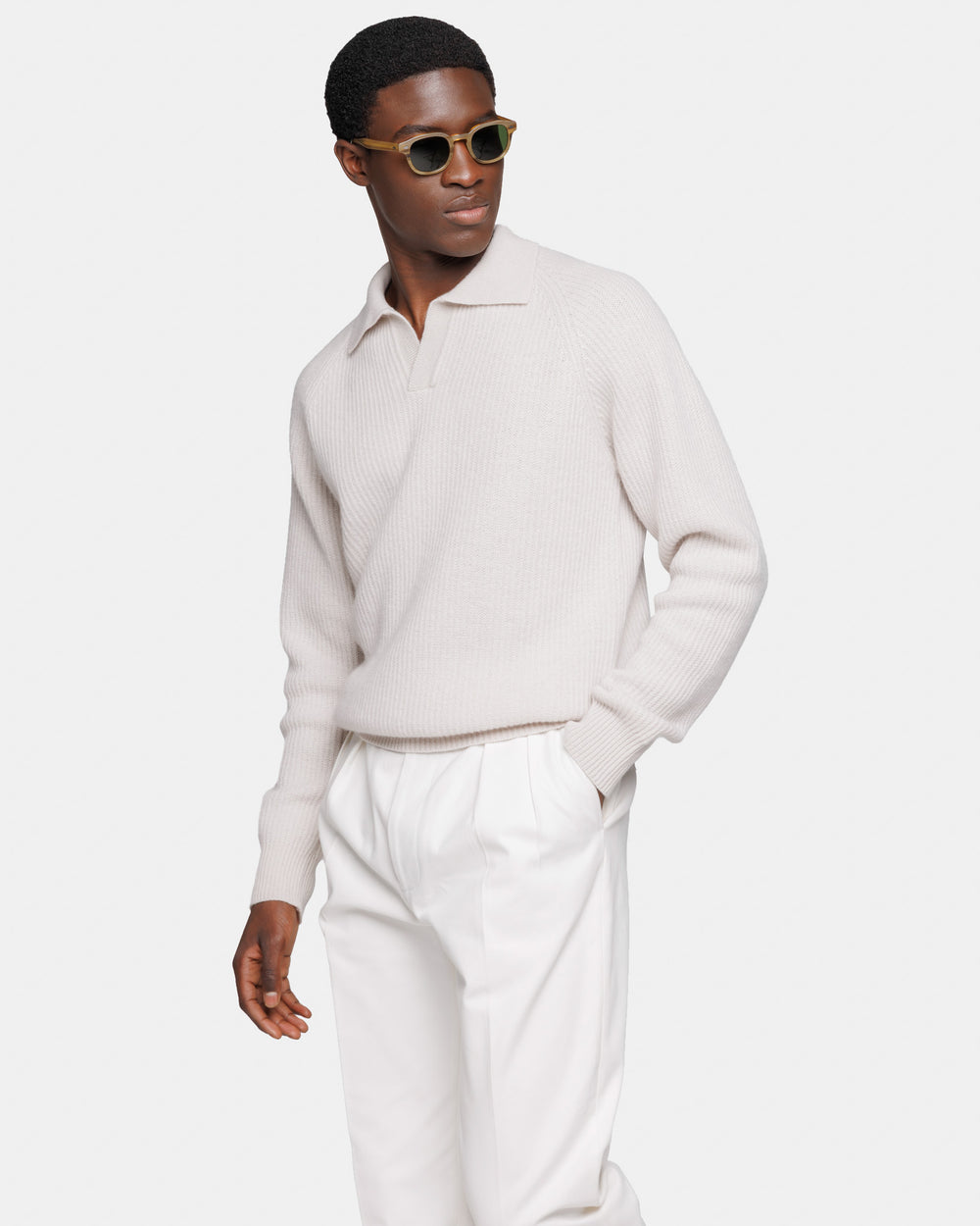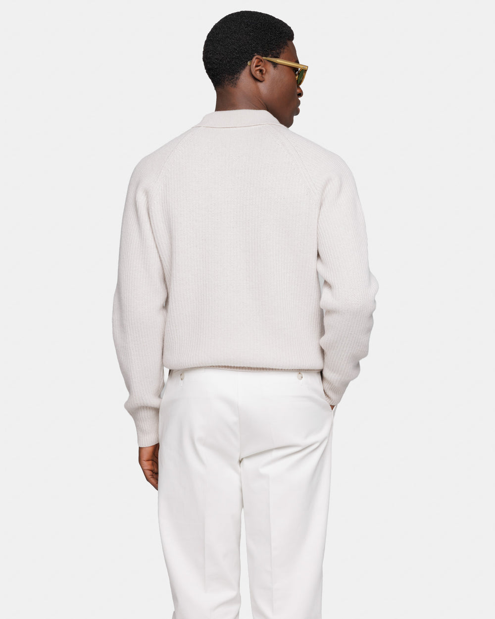 Maglia su misura 2 fili super-fine titolo 1/15 NM, scollo polo senza bottoni, manica lunga tinta unita Meringa, realizzata con lussuosa Lana Cardata Super 100's, una pregiata fibra in lana che si distingue per la sua morbidezza e calore. La Lana Cardata, sottoposta al tradizionale processo di cardatura, dona al filato una consistenza voluminosamente soffice e una capacità termica unica, grazie alla presenza di microscopiche bolle d'aria intrappolate tra le fibre.