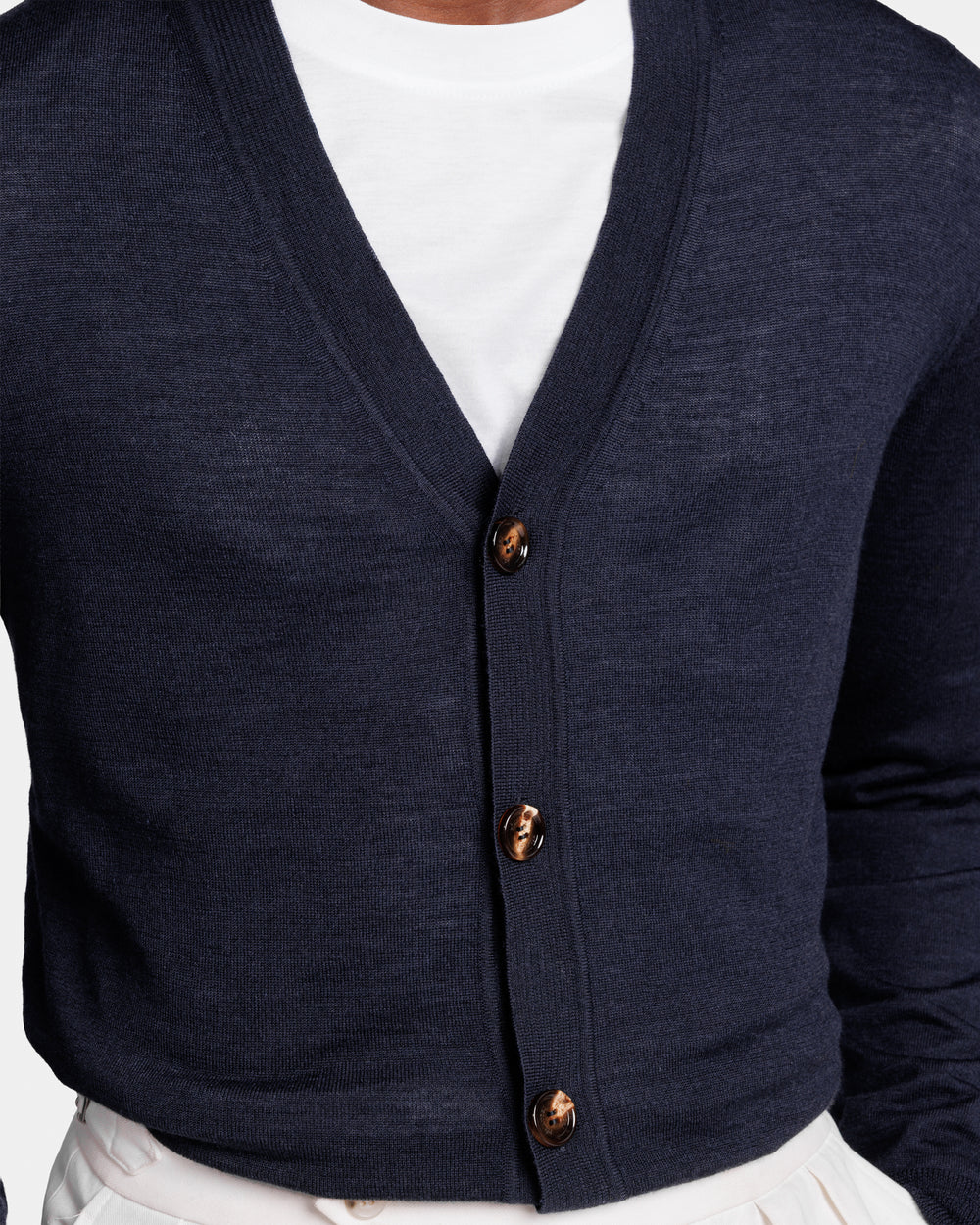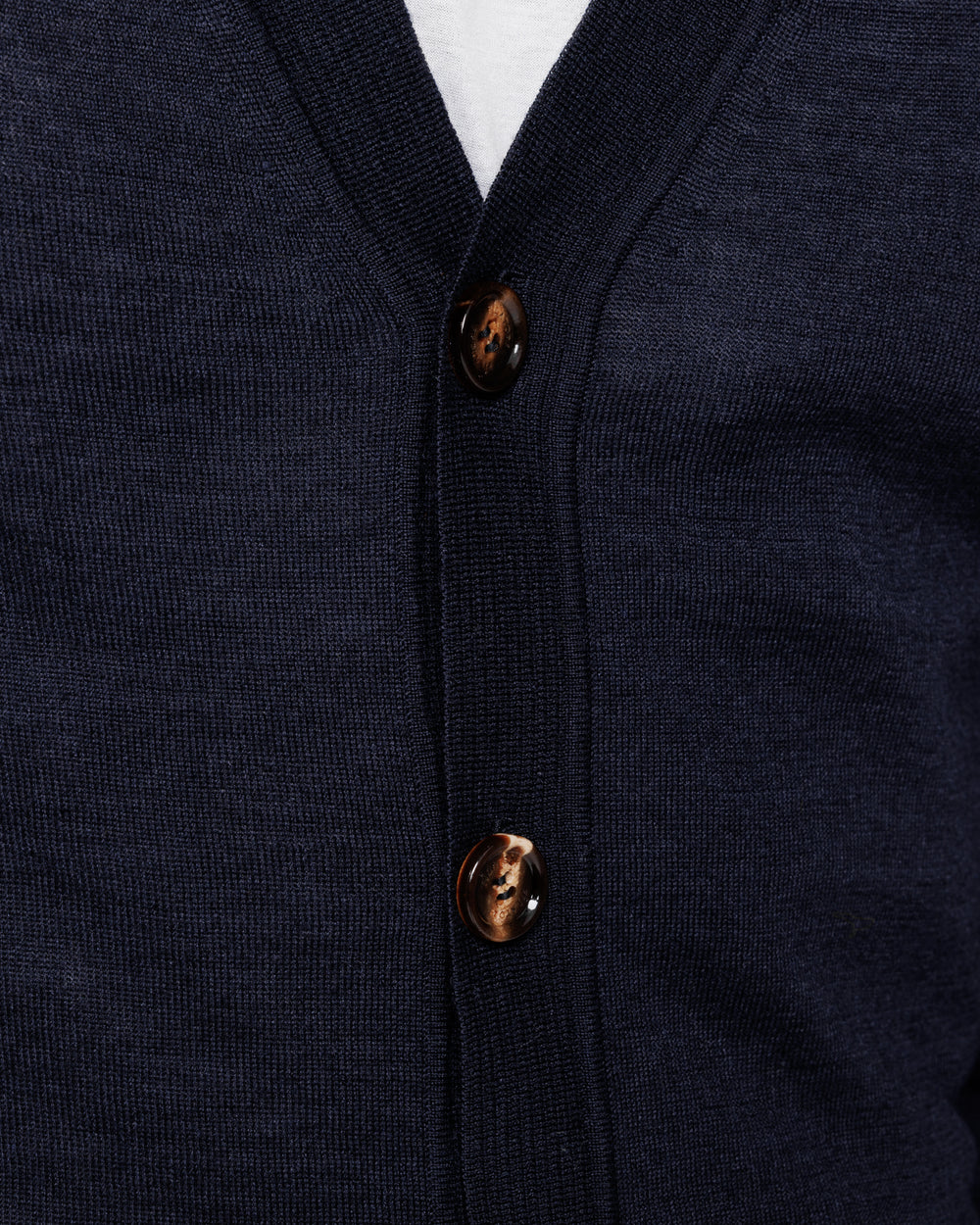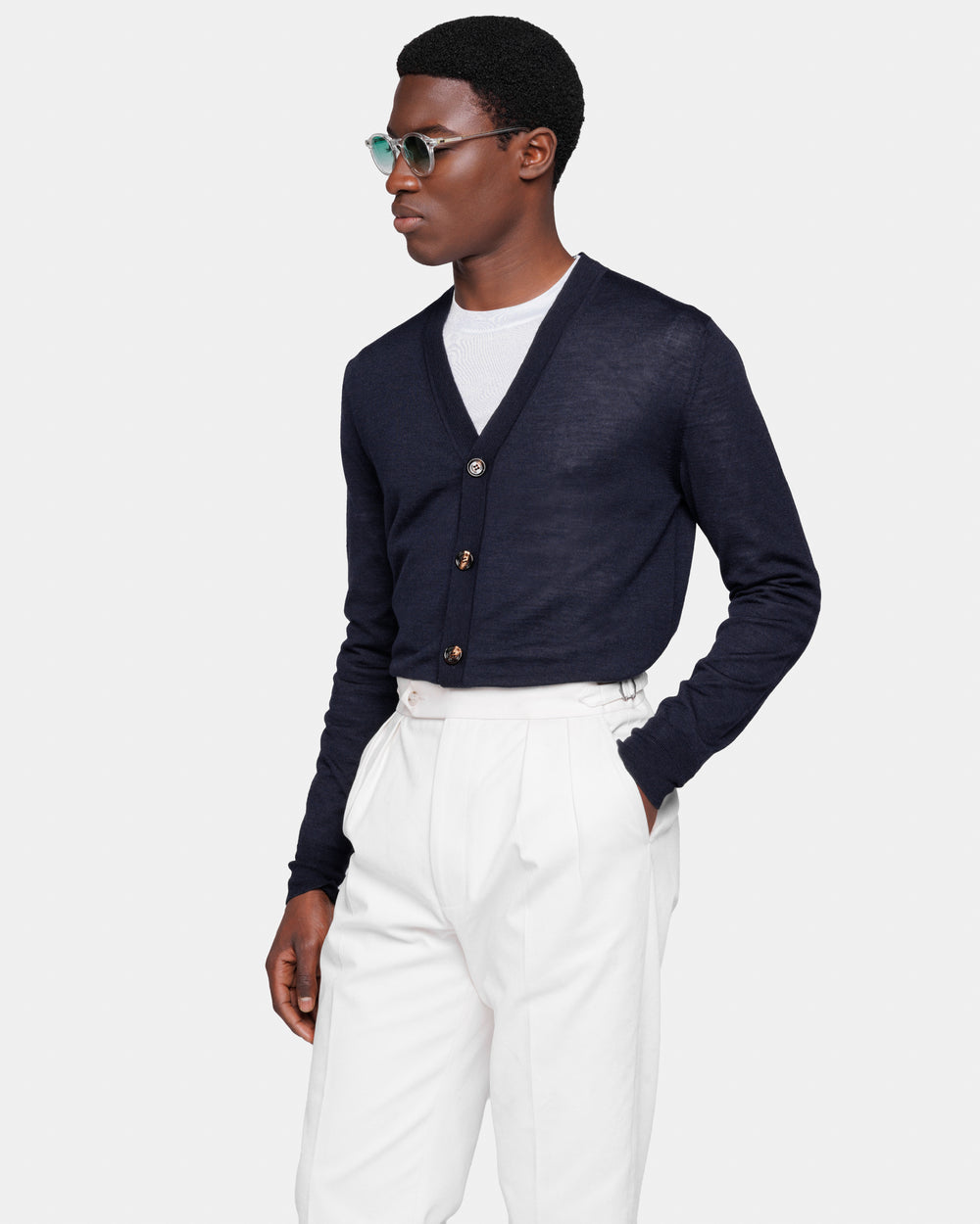 Cardigan su misura in maglia rasata ad 1 filo extra-fine dal titolo 2/48 manica lunga con raffinato scollo a V e chiusura frontale a 5 bottoni in autentico Corno di mucca da 32 mm. Proposto in tinta unita blu navy, è realizzato in una pregiata, luminosa e morbida combinazione di 70% lana Merino extrafine e 30% seta, una miscela di eccezionale qualità che conferisce al capo un aspetto lineare in cui la mischia preziosa mette in particolare risalto la brillantezza della seta. La maglia naturale offre una sensazione di estrema morbidezza sulla pelle, trasformando un design semplice in un capo di lusso.