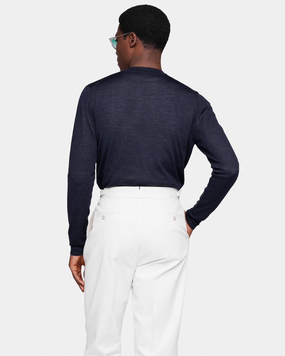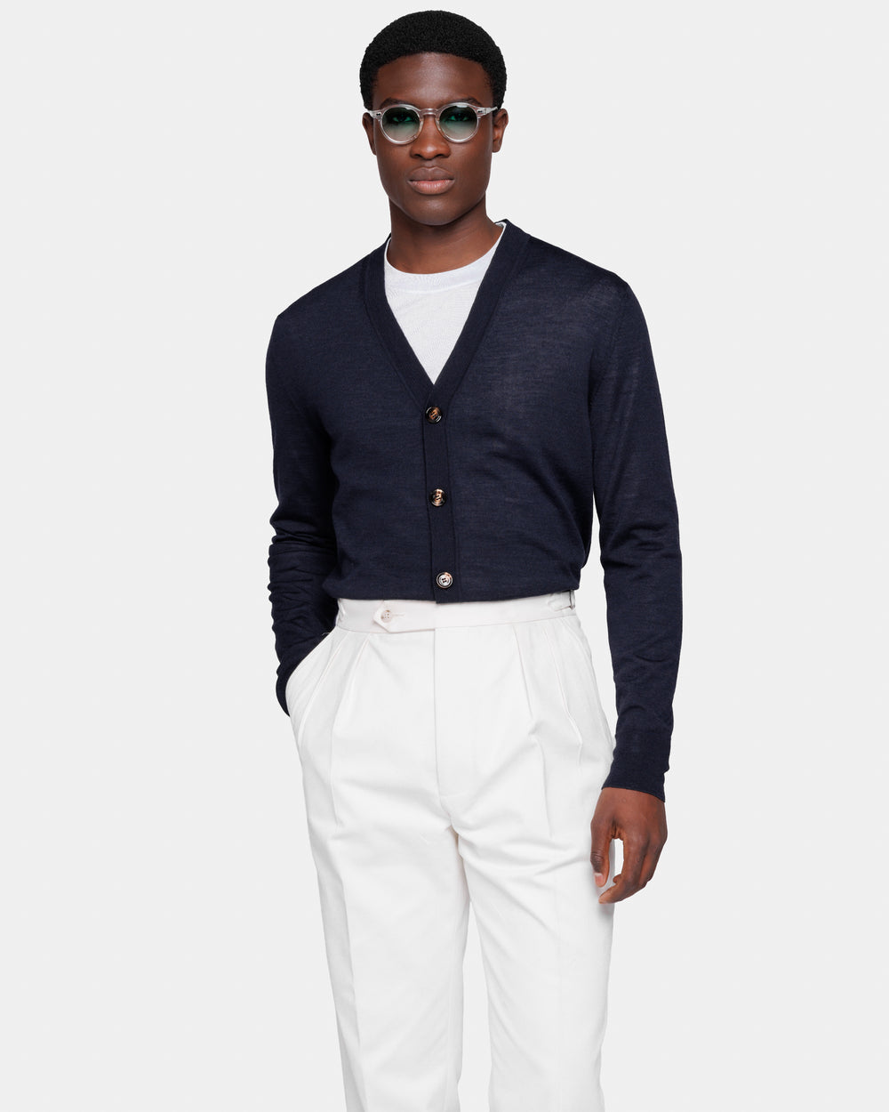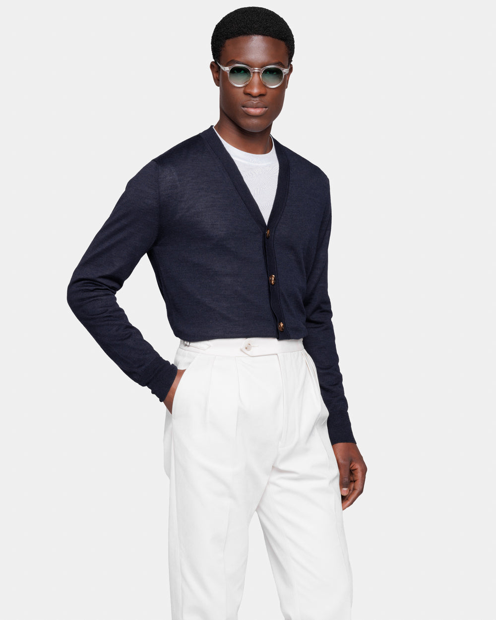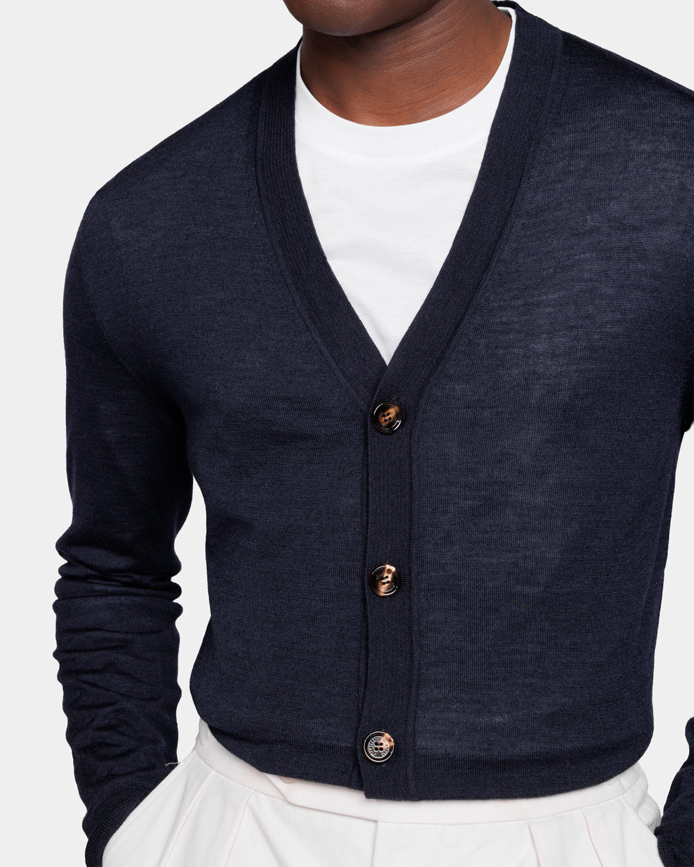Cardigan su misura in maglia rasata ad 1 filo extra-fine dal titolo 2/48 manica lunga con raffinato scollo a V e chiusura frontale a 5 bottoni in autentico Corno di mucca da 32 mm. Proposto in tinta unita blu navy, è realizzato in una pregiata, luminosa e morbida combinazione di 70% lana Merino extrafine e 30% seta, una miscela di eccezionale qualità che conferisce al capo un aspetto lineare in cui la mischia preziosa mette in particolare risalto la brillantezza della seta. La maglia naturale offre una sensazione di estrema morbidezza sulla pelle, trasformando un design semplice in un capo di lusso.