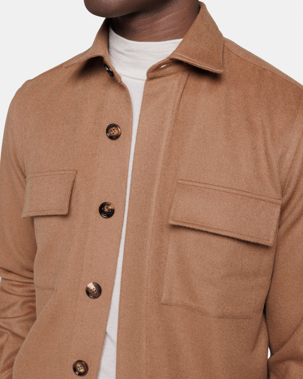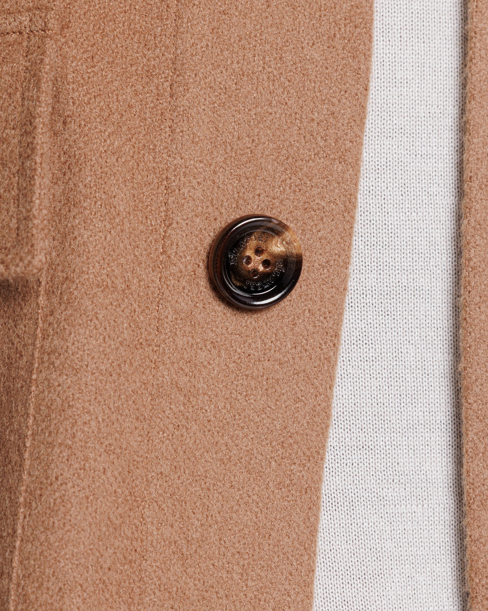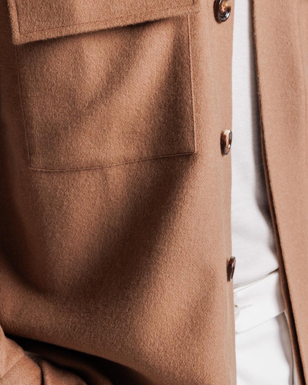 Il tessuto Bactrian 100% Baby Camel Hair Loro Piana made in Italy è una delle espressioni più alte del lusso tessile italiano. Ricavato dal primo vello del cammello battriano, raccolto naturalmente durante la muta, è una fibra rarissima, estremamente fine e morbida, paragonabile al miglior cashmere ma più resistente. Offre un’eccellente termoregolazione, risultando caldo ma traspirante, ed è ideale per capi come le overshirt grazie alla sua leggerezza con struttura. Al tatto è setoso, visivamente elegante e opaco, con una profondità naturale del colore tabacco. Lavorato interamente in Italia, rappresenta un equilibrio perfetto tra comfort, raffinatezza e durabilità.