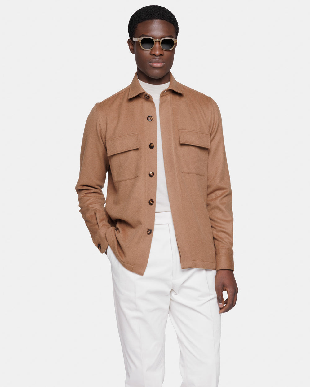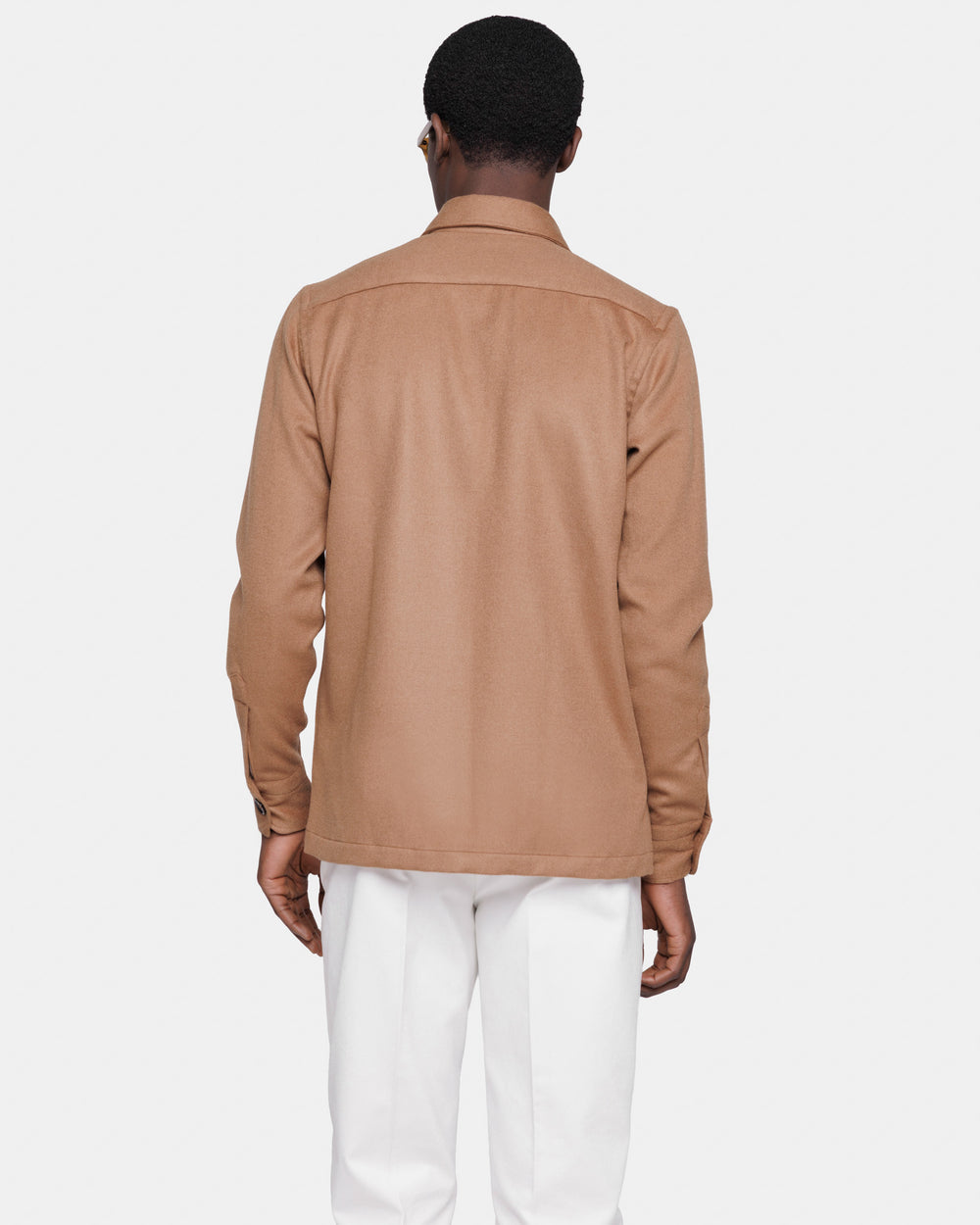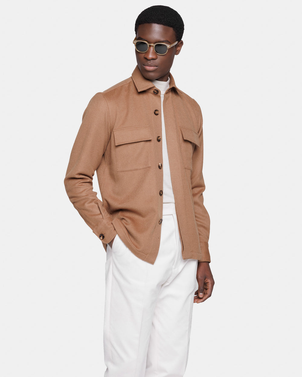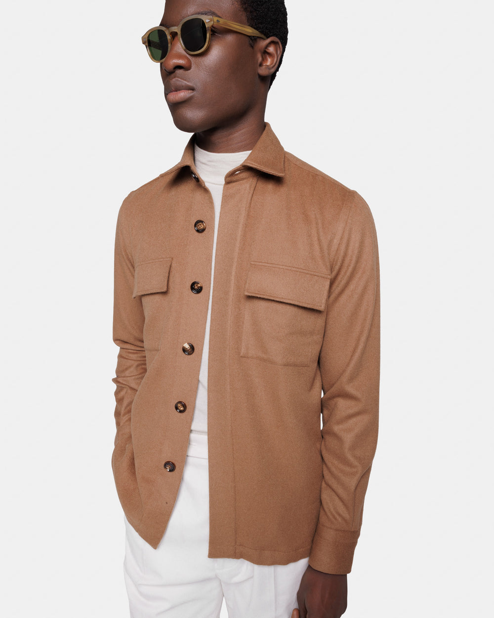 Il tessuto Bactrian 100% Baby Camel Hair Loro Piana made in Italy è una delle espressioni più alte del lusso tessile italiano. Ricavato dal primo vello del cammello battriano, raccolto naturalmente durante la muta, è una fibra rarissima, estremamente fine e morbida, paragonabile al miglior cashmere ma più resistente. Offre un’eccellente termoregolazione, risultando caldo ma traspirante, ed è ideale per capi come le overshirt grazie alla sua leggerezza con struttura. Al tatto è setoso, visivamente elegante e opaco, con una profondità naturale del colore tabacco. Lavorato interamente in Italia, rappresenta un equilibrio perfetto tra comfort, raffinatezza e durabilità.