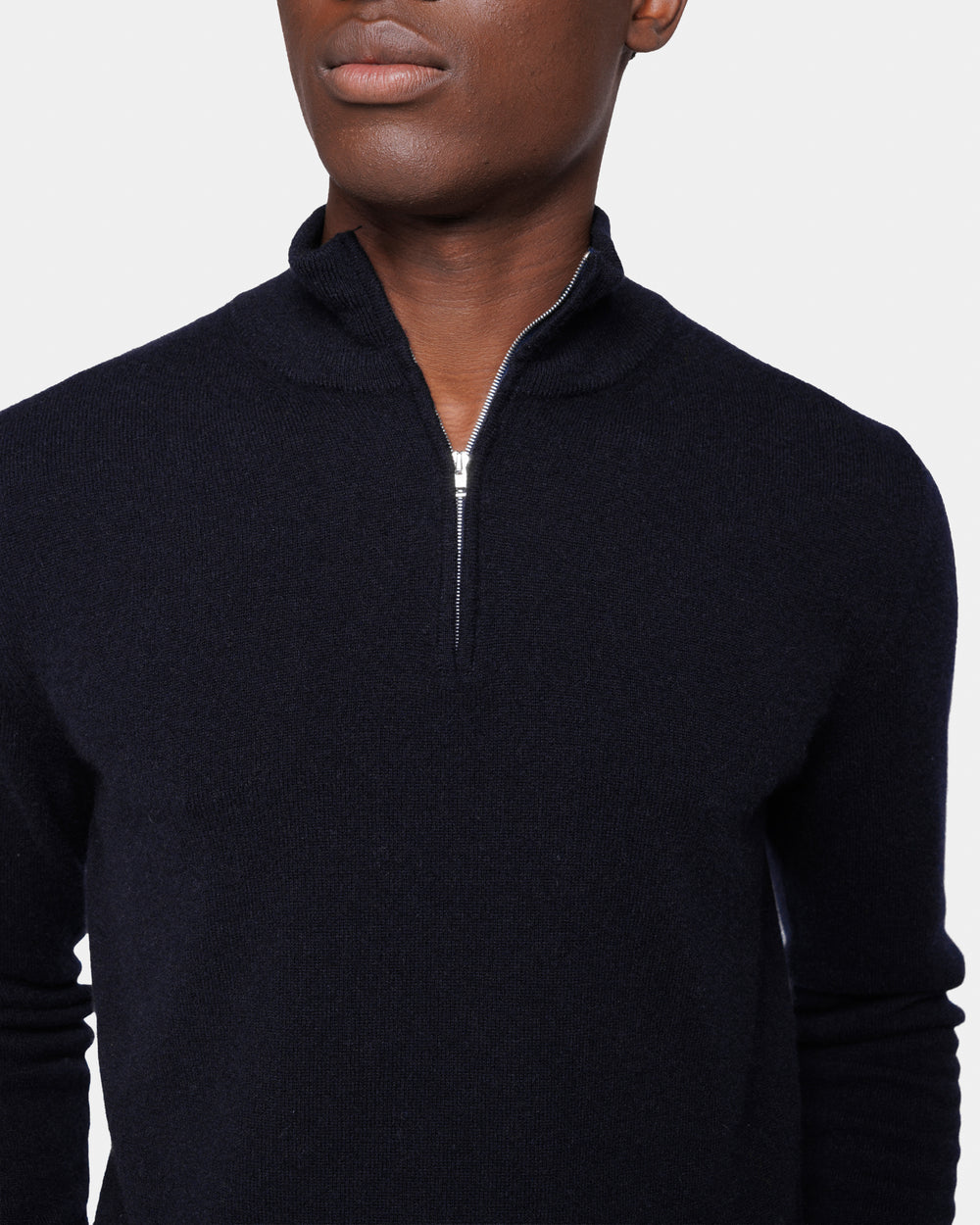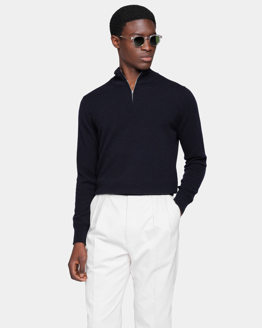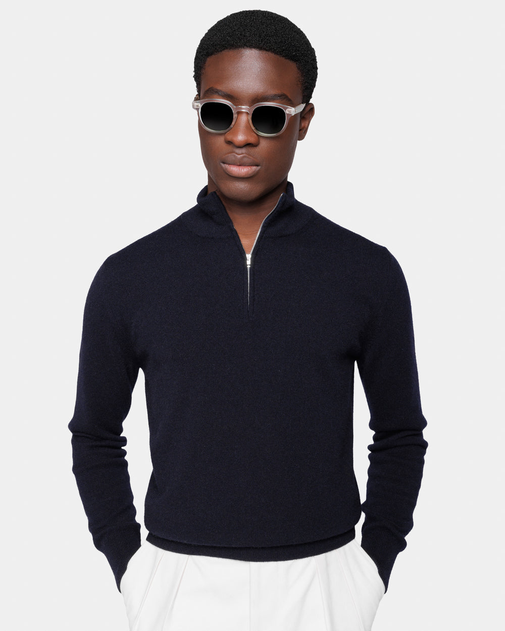 Tailor-made 1-ply half zip knit with a 20 cm Riri zipper, 2/27 yarn gauge, long sleeves, in blue color, made from a precious, refined, and ultra-fine pure cashmere Crown Reserve fiber coming from the most remote regions of Mongolia, then reaching the mills of Quarona Sesia in Piedmont, where it is skillfully processed by the world’s most prestigious spinning mill to give life to a 2/27 carded yarn.