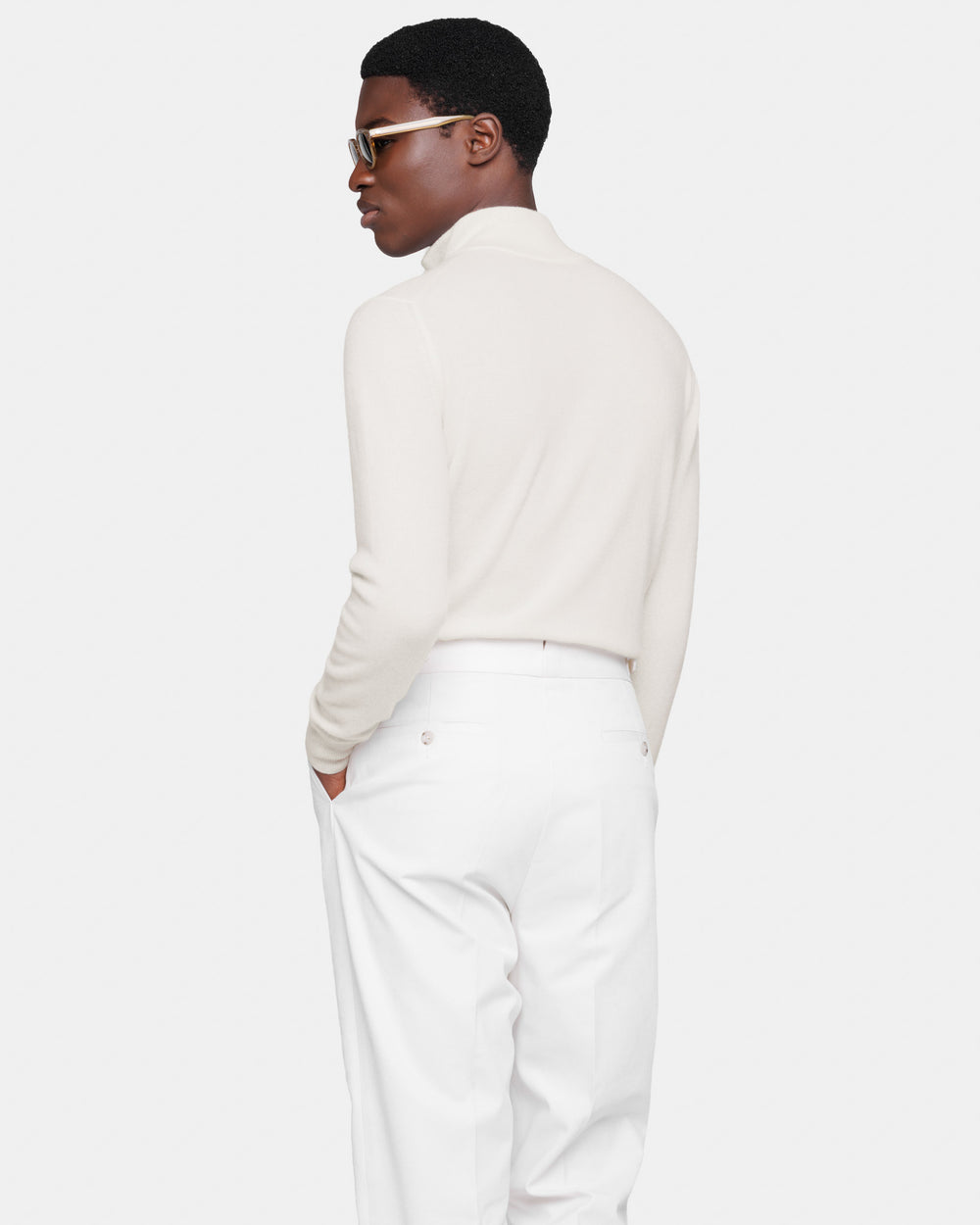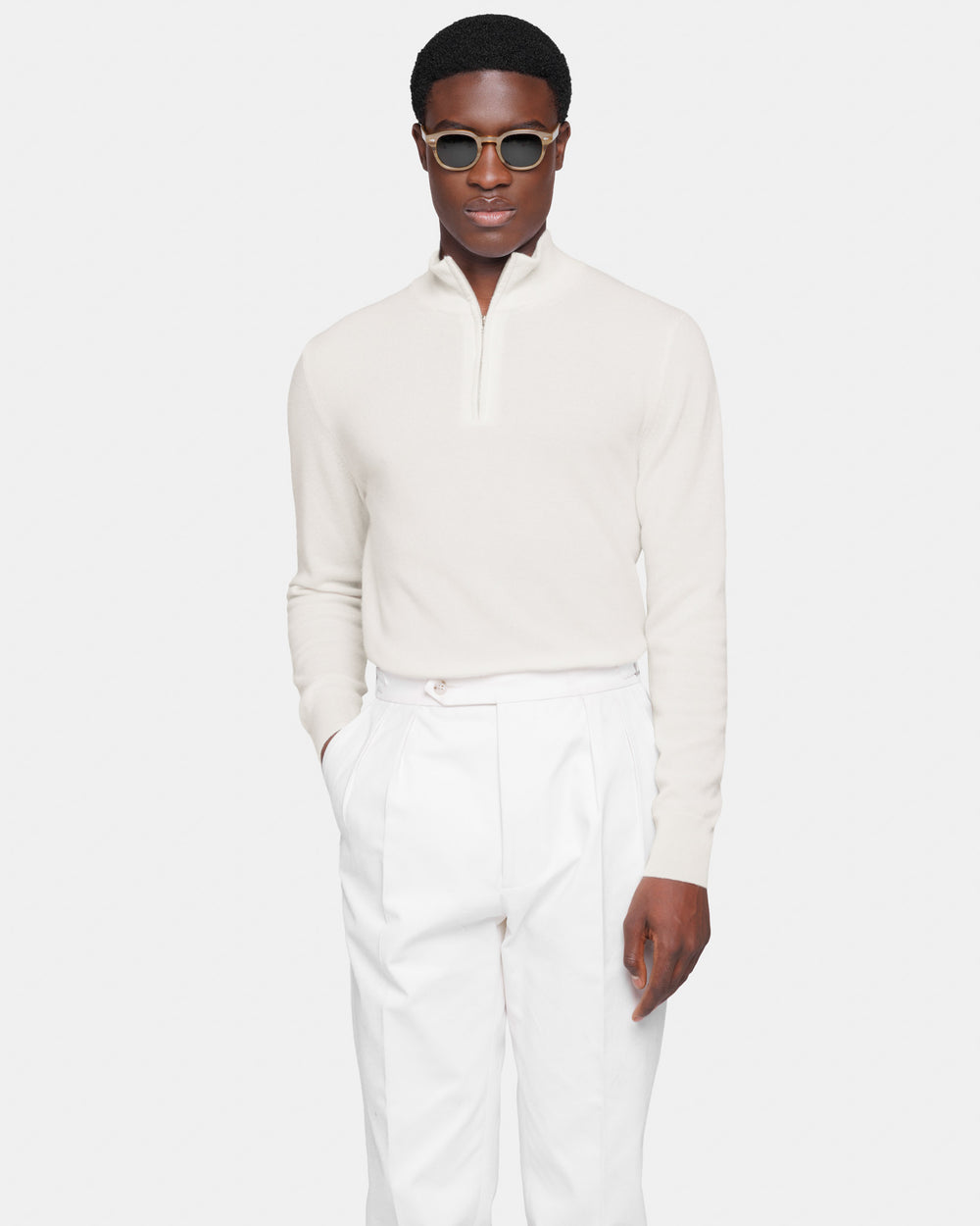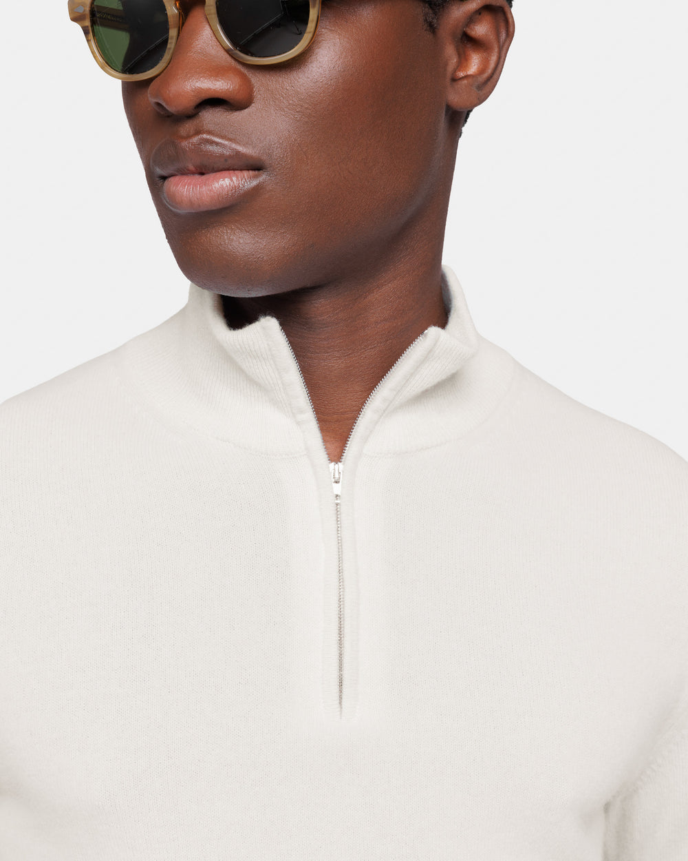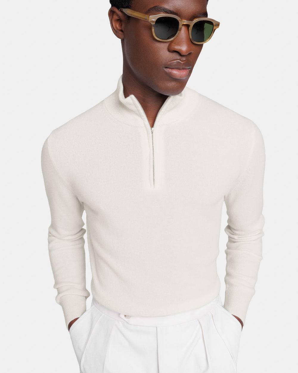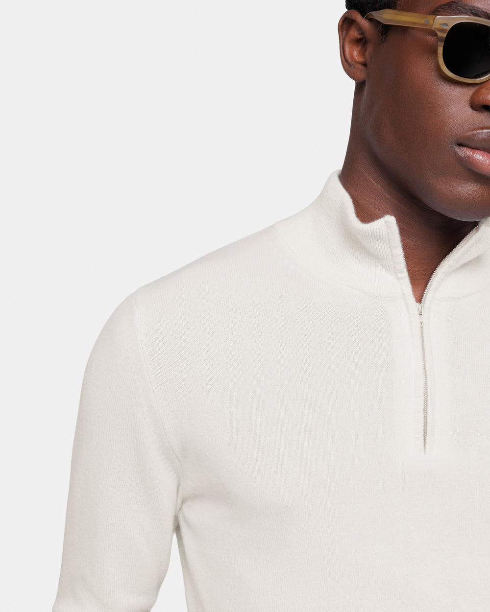 Tailor-made 1-ply half zip knit with a 20 cm Riri zipper, 2/27 yarn gauge, long sleeves, in off-white color, made from a precious, refined, and ultra-fine pure cashmere Crown Reserve fiber coming from the most remote regions of Mongolia, then reaching the mills of Quarona Sesia in Piedmont, where it is skillfully processed by the world’s most prestigious spinning mill to give life to a 2/27 carded yarn.