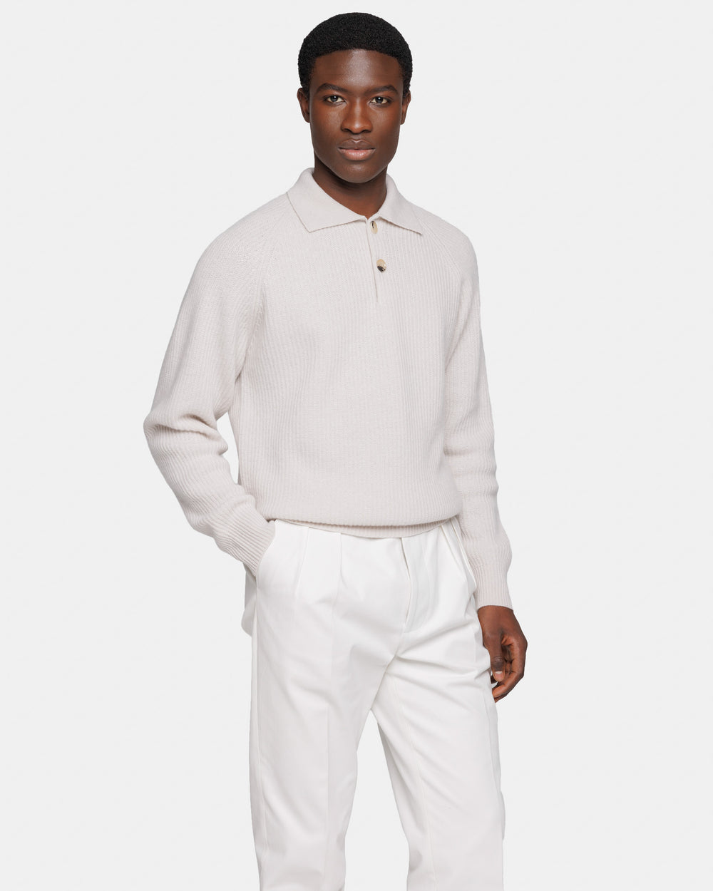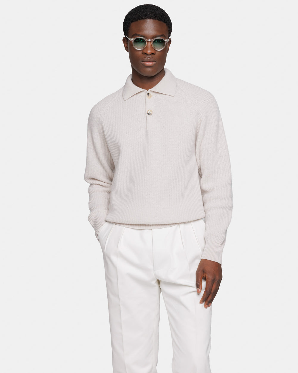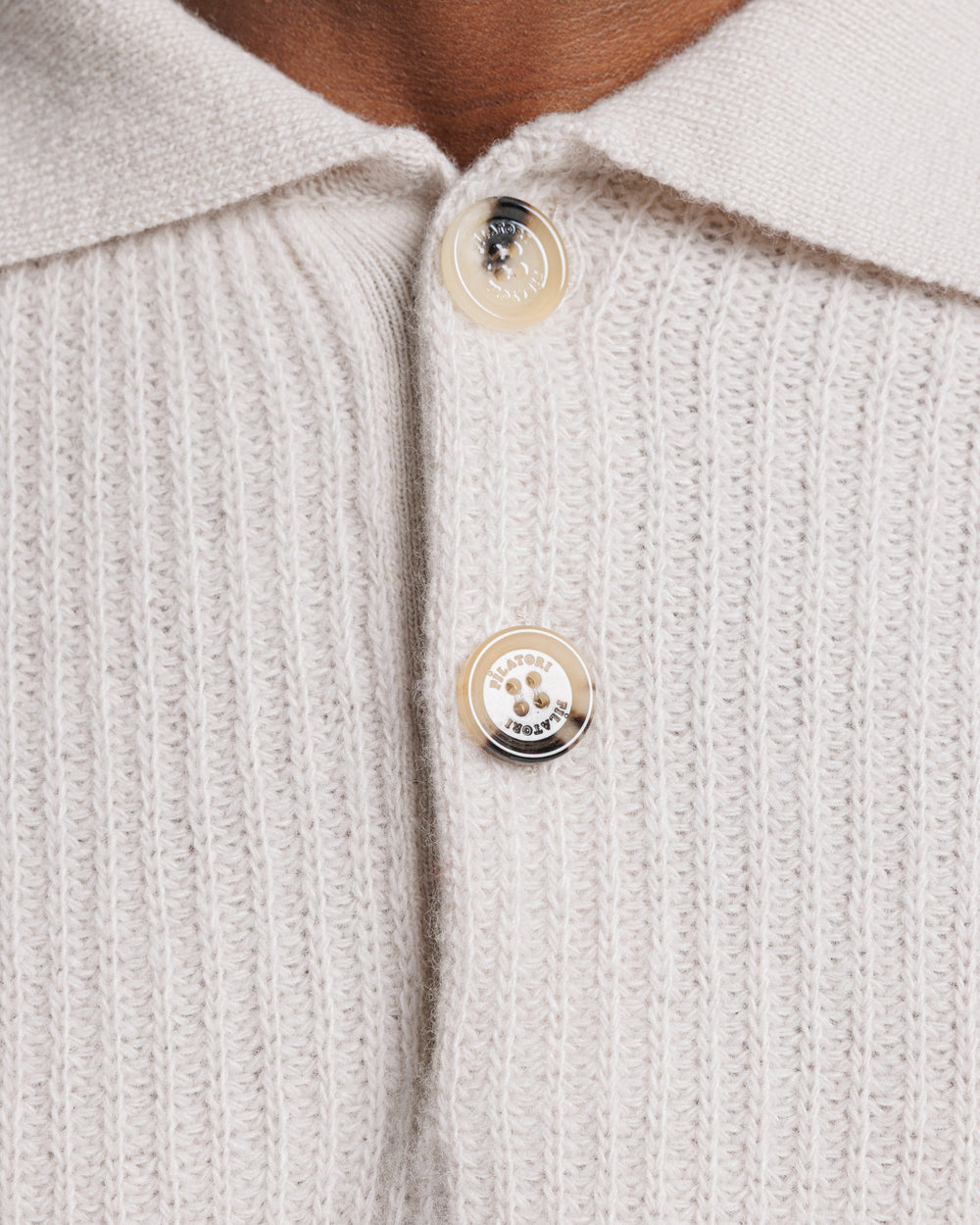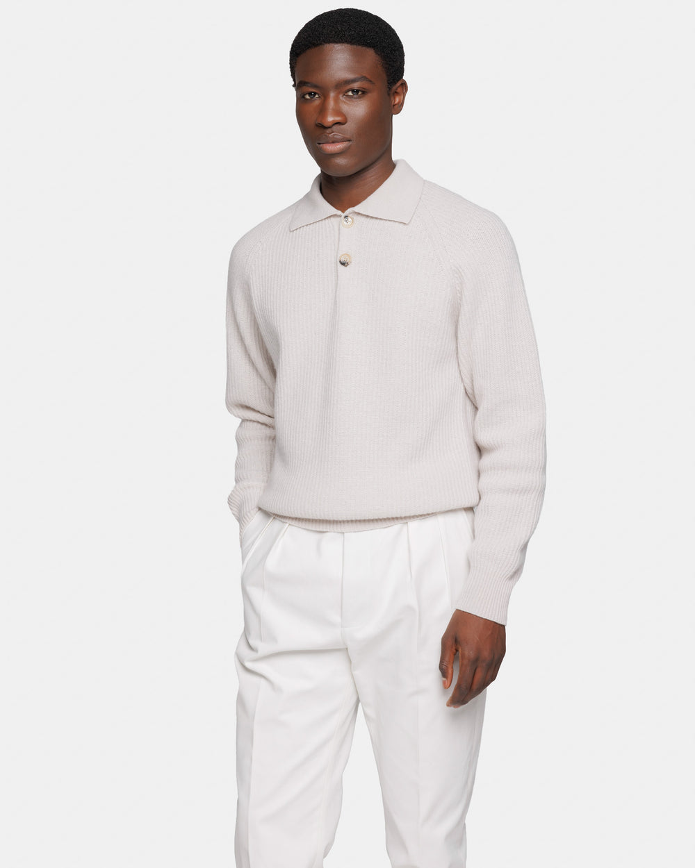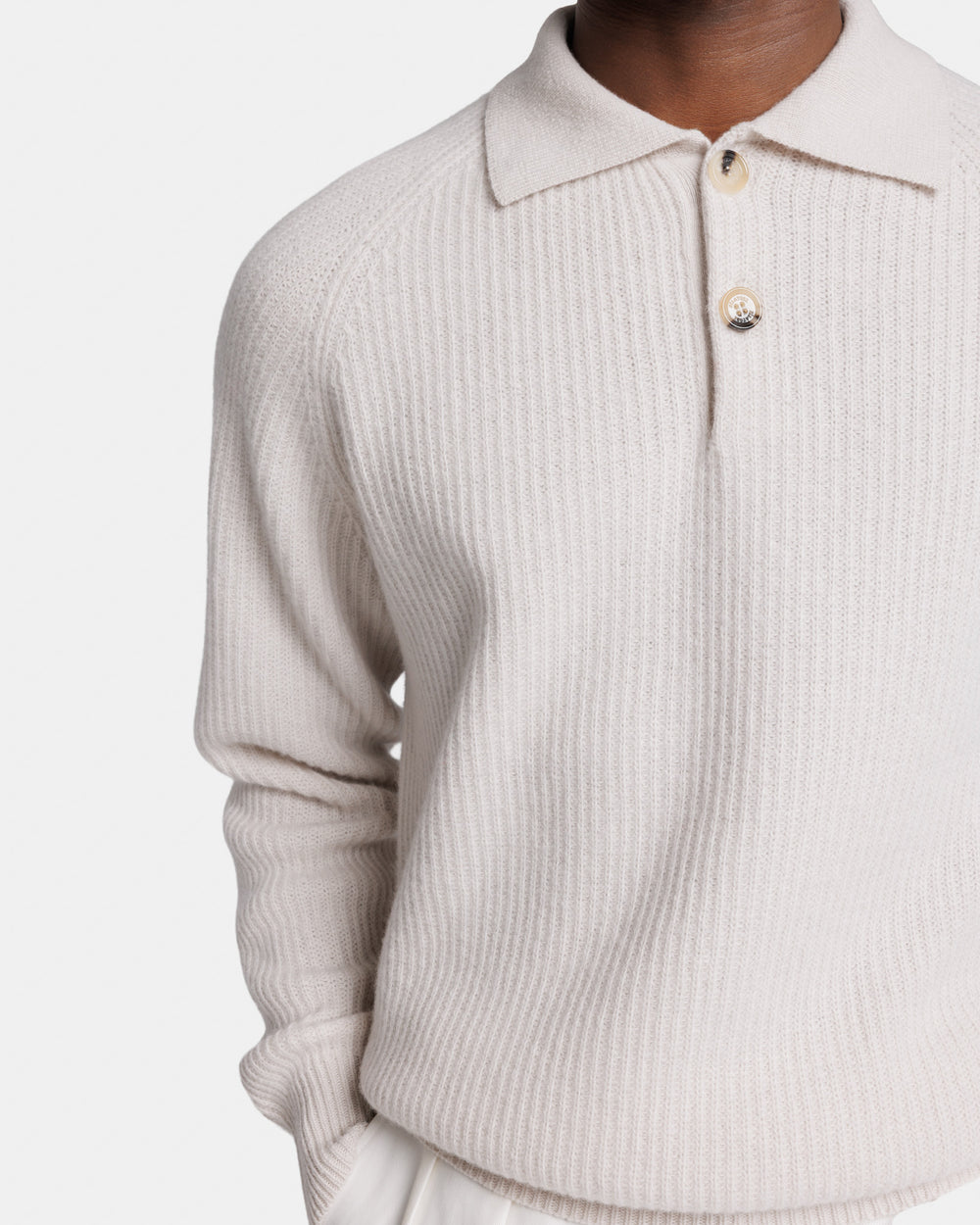Polo knitwear with two authentic 32 mm horn buttons in 2-ply superfine yarn, 1/15 NM, long sleeves, solid meringue, made with luxurious Super 100's Carded Wool, a premium wool fiber known for its softness and warmth. The carded wool, subjected to the traditional carding process, gives the yarn a voluminous, soft texture and unique thermal properties, thanks to the microscopic air bubbles trapped between the fibers.