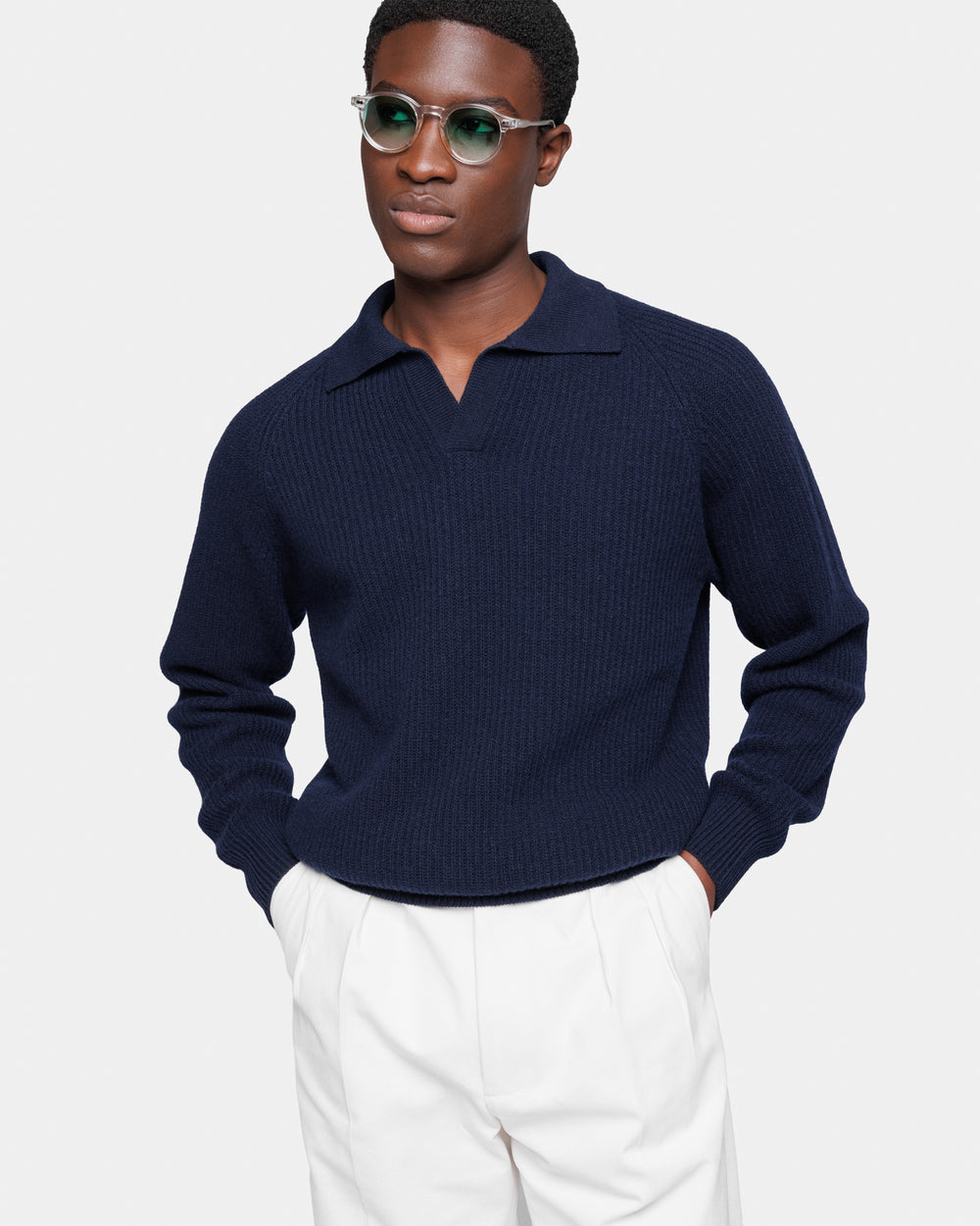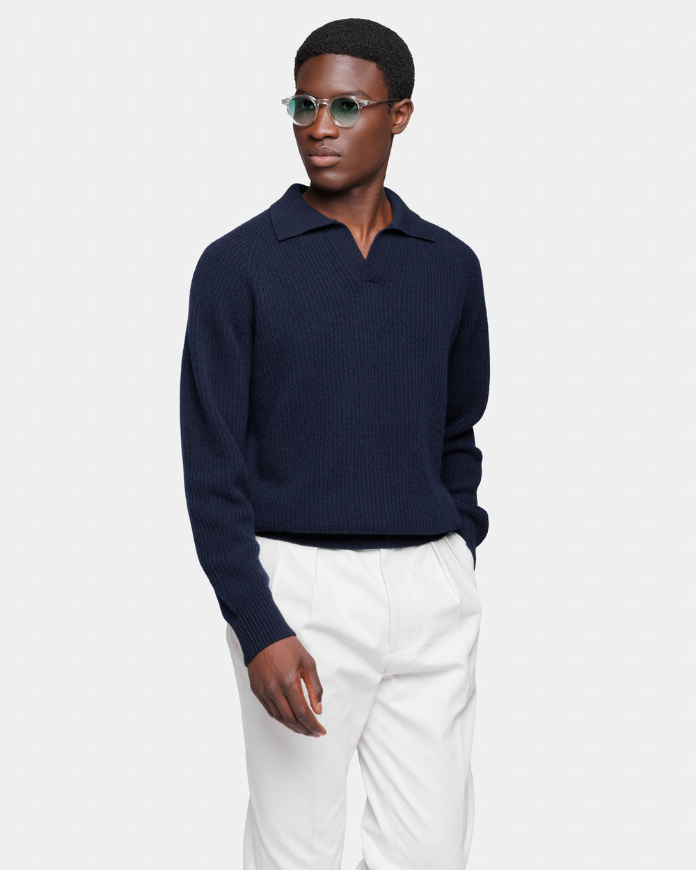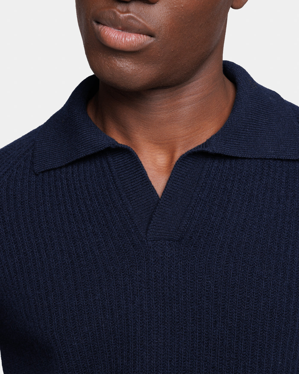 Buttonless polo knitwear in 2-ply superfine yarn, 1/15 NM, long sleeves, solid blue, made with luxurious Super 100's Carded Wool, a premium wool fiber known for its softness and warmth. The carded wool, subjected to the traditional carding process, gives the yarn a voluminous, soft texture and unique thermal properties, thanks to the microscopic air bubbles trapped between the fibers.