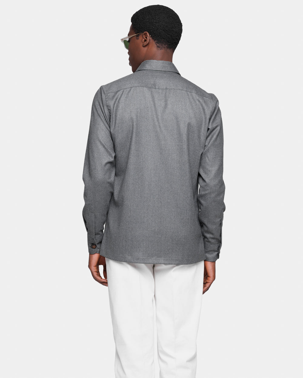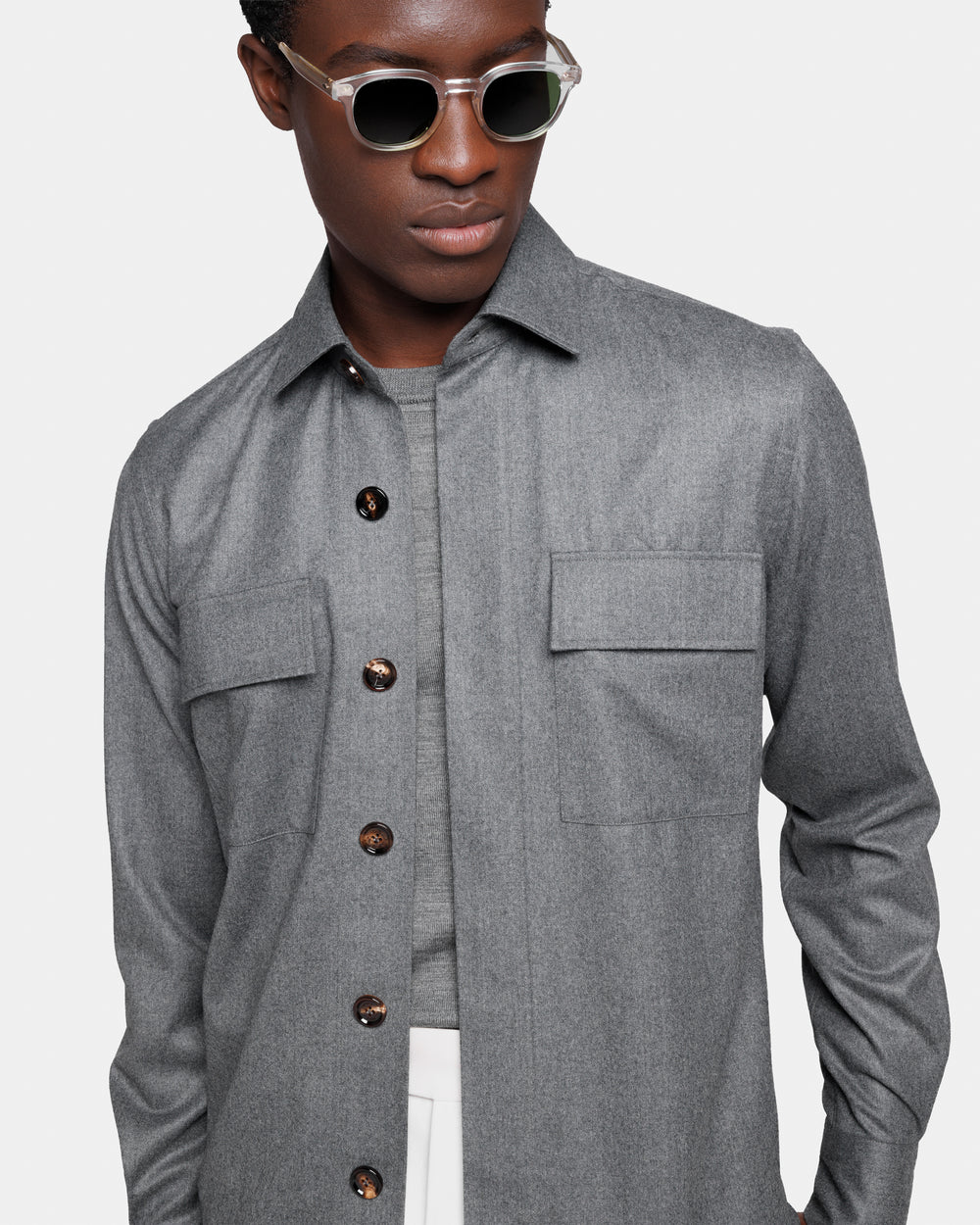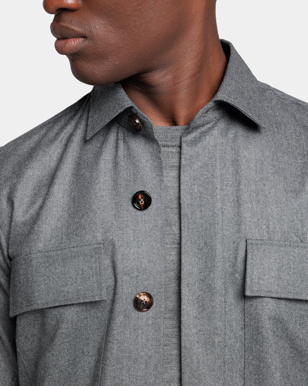 Tailor-made grey solid-color Overshirt with authentic 32 mm Buffalo Horn buttons, crafted from the precious Australian Saxon Merino ‘Intrepid’ Super 150’s wool by Lanificio Vitale Barberis Canonico, a symbol of Made in Italy excellence in the production of fine wools.