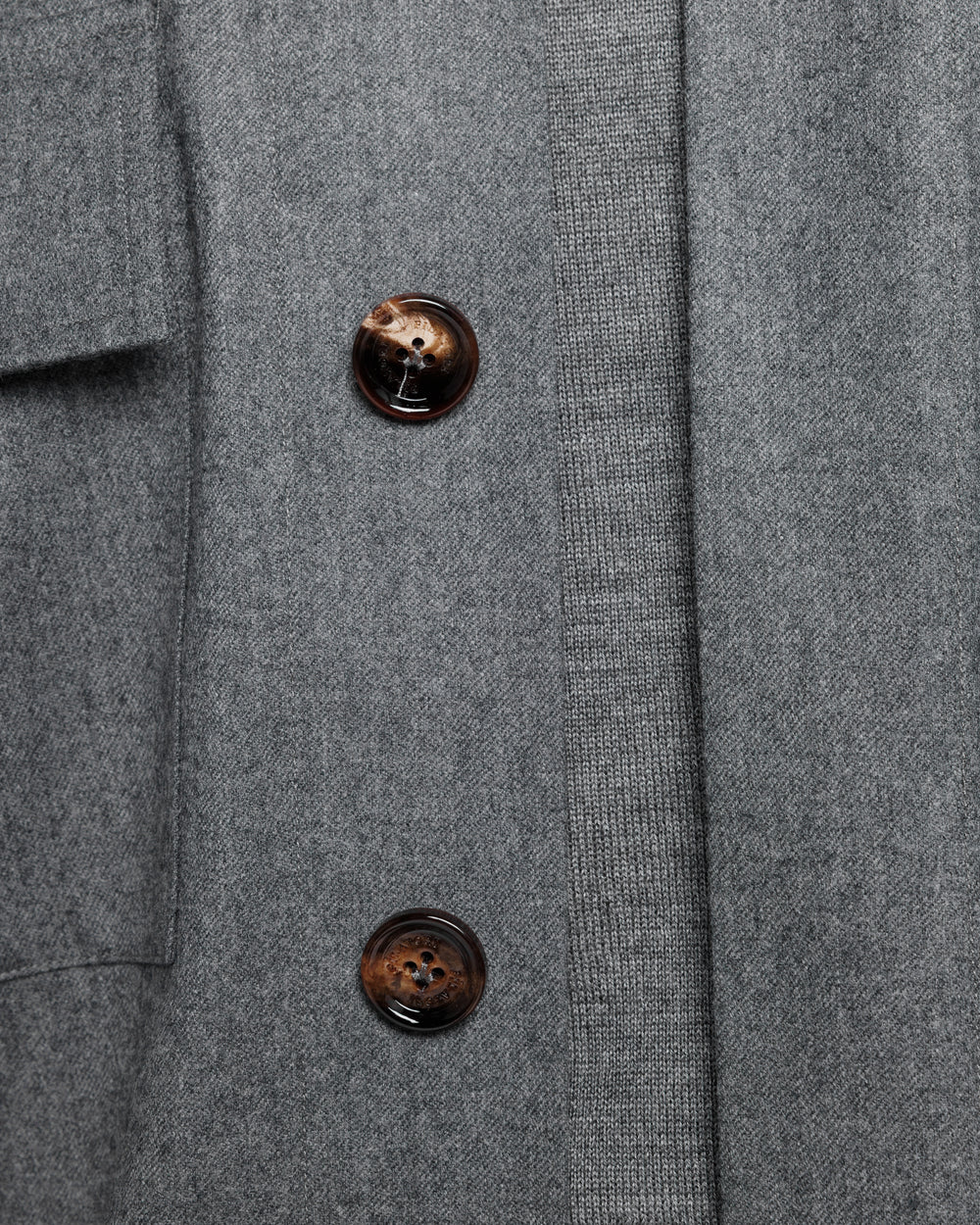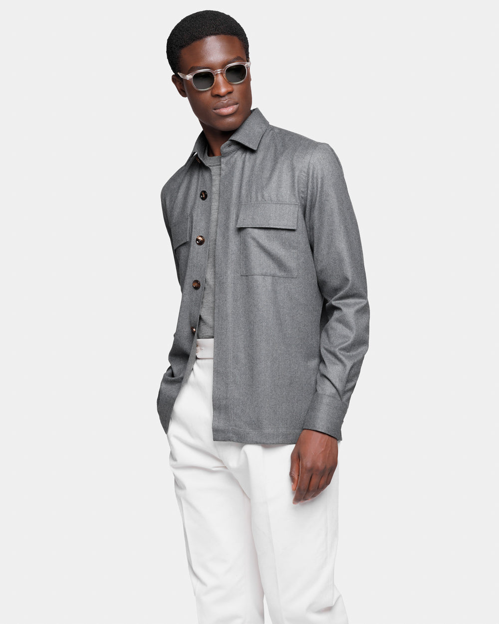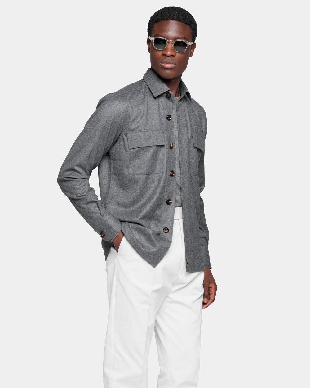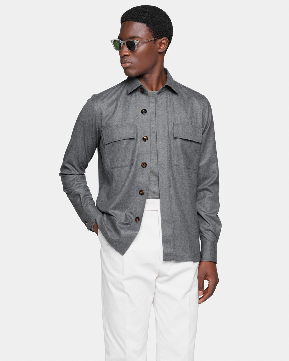 Tailor-made grey solid-color Overshirt with authentic 32 mm Buffalo Horn buttons, crafted from the precious Australian Saxon Merino ‘Intrepid’ Super 150’s wool by Lanificio Vitale Barberis Canonico, a symbol of Made in Italy excellence in the production of fine wools.